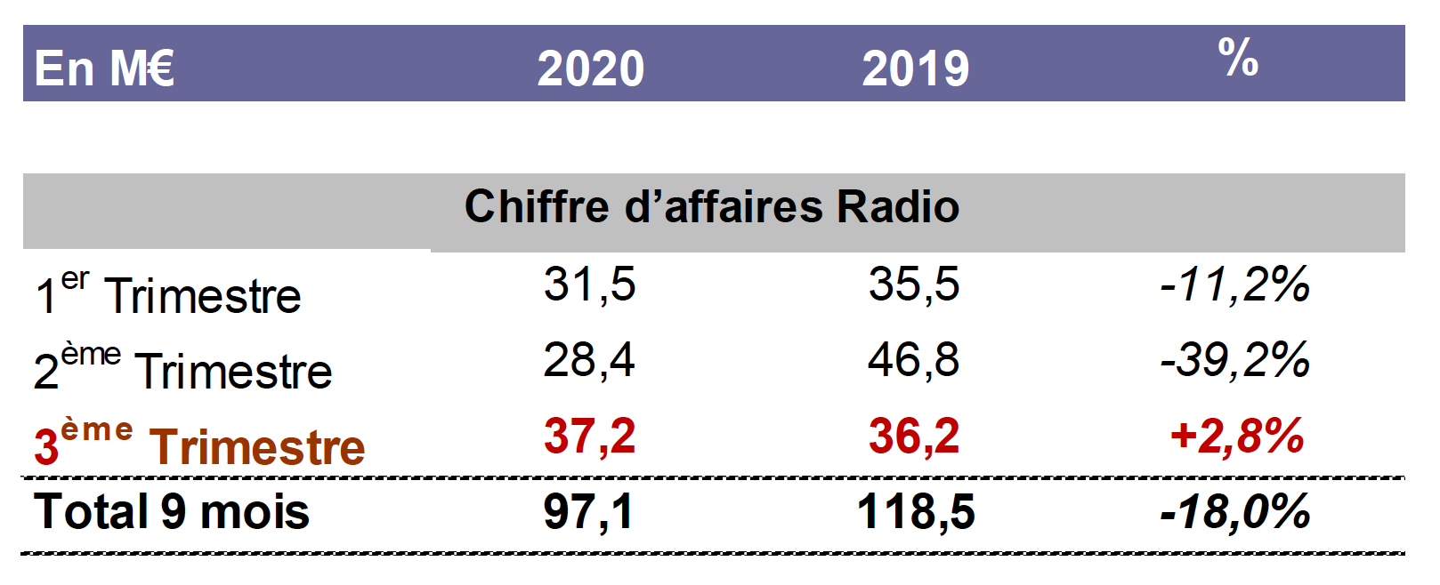 Dans le contexte de relance économique post-confinement, la publicité Radio a bénéficié notamment de sa capacité à favoriser le trafic en magasin ("drive-to-store"). Au 3e trimestre, le marché publicitaire Radio a ainsi nettement rebondi par rapport aux plus bas du printemps, permettant aux recettes du pôle Radio du Groupe M6 d’afficher une hausse de +2.8%.