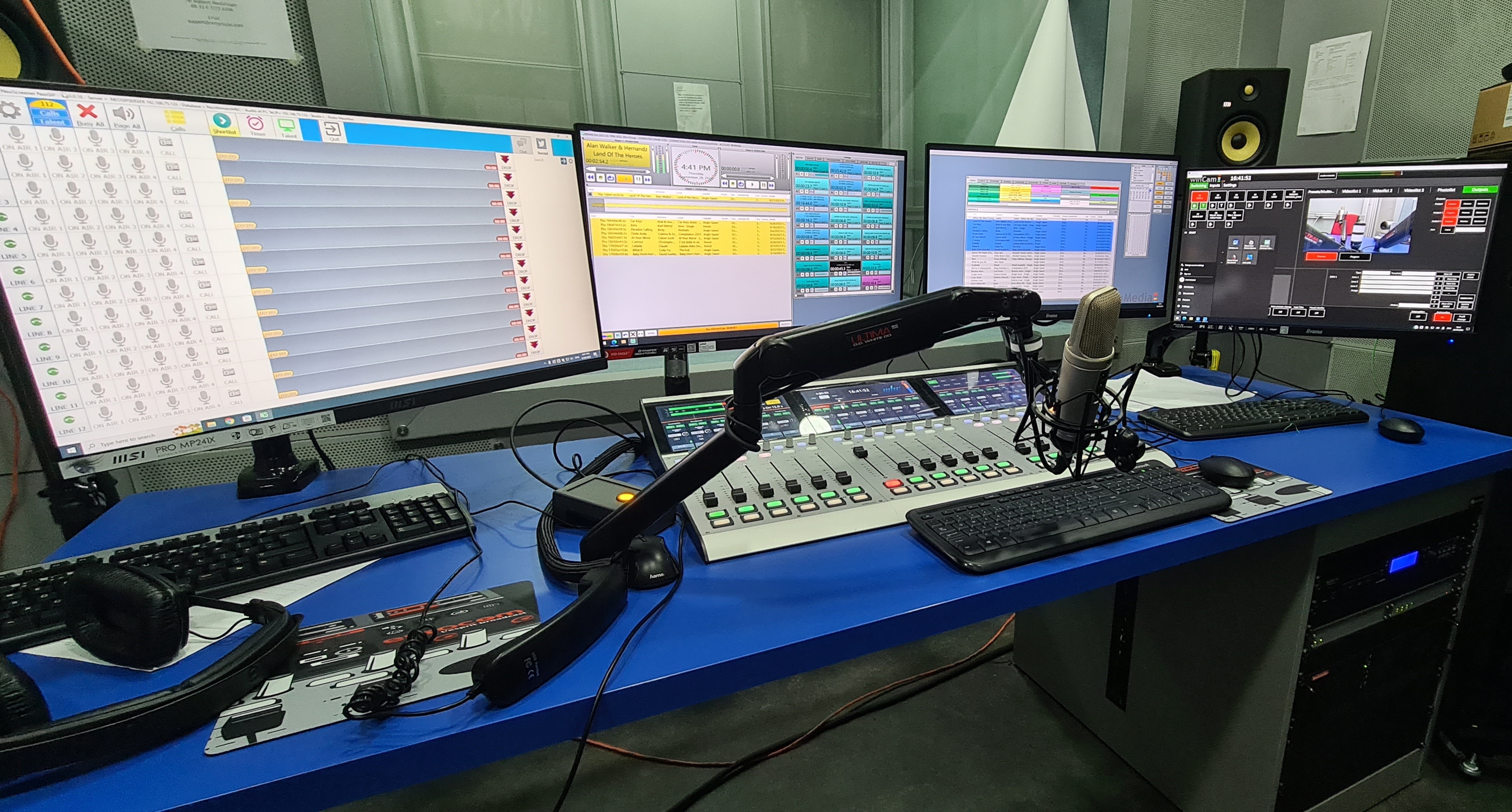 En même temps nous avons équipé les studios de caméras 4K avec notre logiciel WinCam de gestion automatique de production vidéo pour la radio filmée. Cela permet avec la connexion au WinMedia de faire une réalisation automatique en fonction des intervenants qui parlent en plateau, de publier en temps réel sur les réseaux sociaux et de préparer et enregistrer des podcasts vidéo".