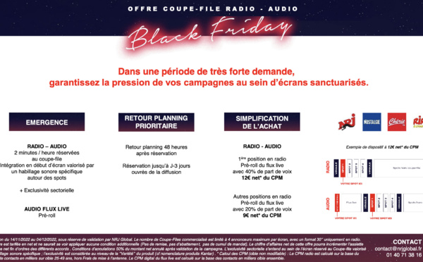 NRJ Global annonce le lancement l'offre commerciale "Coupe-file Back Friday" aux emplacements ultra-émergents et au mode d'achat facilité au CPM. NRJ Global a restreint sa durée publicitaire en radio à 9 minutes par heure en moyenne, sur ses écrans nationaux, pour préserver le contrat d’écoute avec ses auditeurs et maximiser l’émergence des campagnes des annonceurs.