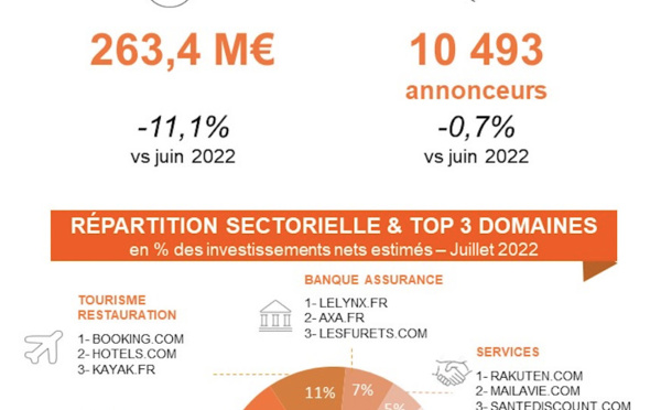 Ce nouveau Baromètre Paid Search mensuel réalisé par Kantar propose un zoom sur le mois de juillet 2022 et revient sur le niveau d’investissements nets par rapport à juin 2022, le nombre d’annonceurs ainsi que la répartition sectorielle et le top 3 domaines pour chaque marché.
