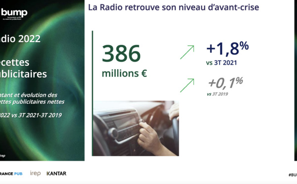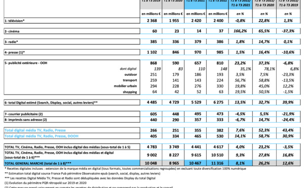 Les 9 premiers mois de l’année 2022 confortent la dynamique engagée depuis le début de l’année. En effet de janvier à septembre, sur le périmètre observé par l’IREP (télévision, cinéma, radio, presse, publicité extérieure, courrier publicitaire, imprimés sans adresse) qui inclut également les recettes digitales, les recettes publicitaires nettes de l’ensemble des médias s’élèvent à 11.316 milliards d’euros, en progression de + 8.1% par rapport aux 3T 2021.