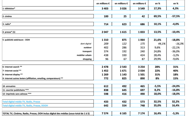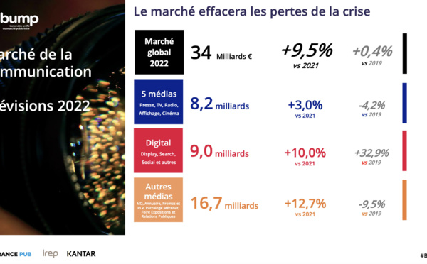 Portée par toutes les composantes de la demande intérieure et les perspectives du plan d’investissement "France 2030", la croissance du PIB est estimée à environ 3.5% en 2022. Avec une valeur estimée d’environ 34 Mds d’euros et une croissance de 9.4%, le marché publicitaire 2022 effacera l’ensemble des pertes de 2020. Pour mémoire, il avait fallu 8 ans pour effacer celles de la crise de 2009.