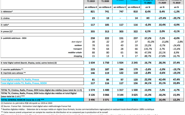 Les recettes publicitaires nettes de l’ensemble des médias incluant le digital s’élèvent à 15.933 milliards d’euros, en forte progression de 18.3% par rapport à 2020 (+ 5.1% vs 2019). L’ensemble des médias affiche des résultats positifs et les synergies avec le digital s’amplifient. La radio est également en forte croissance, à +10.1% versus 2020, et à -4% versus 2019.
