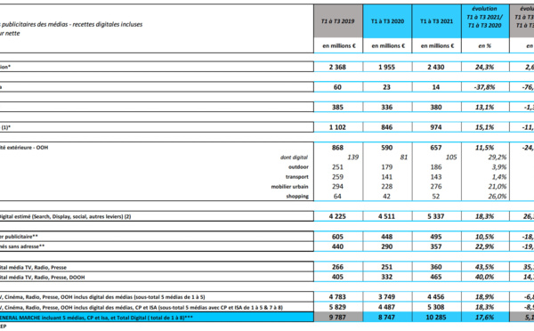 Les 9 premiers mois de l’année 2021 confirment une nette reprise du marché publicitaire. En effet de janvier à septembre, les recettes publicitaires nettes de l’ensemble des médias s’élèvent à 10.285 milliards d’euros, en bonne progression de + 17.6% par rapport aux 3T de 2020 (+ 5/1% versus 3T 2019).