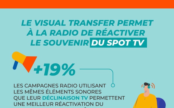 Les marques jouant le Visual Transfer bénéficient d’un souvenir spontané 37% supérieur à celles utilisant des créations publicitaires différentes entre la TV et la radio. Les campagnes radio utilisant les mêmes éléments sonores que leur déclinaison TV permettent une réactivation du souvenir du spot TV mesurée à +19% grâce au pouvoir d’évocation de la radio.