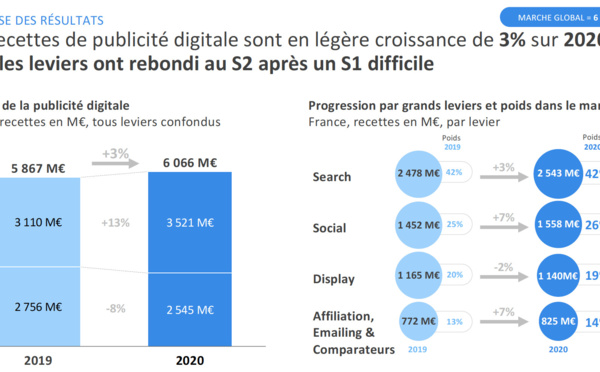 Malgré un premier semestre impacté par la crise sanitaire, le marché français de la publicité digitale est en croissance de 3% sur l’année 2020, et cela grâce à un rebond significatif au second semestre. C'est l'un des enseignements du 25e Observatoire de l’e-pub, réalisé par le cabinet Oliver Wyman pour le SRI et l’UDECAM...