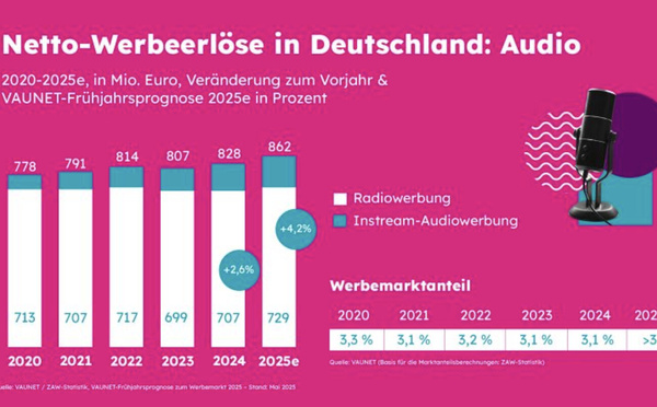 Selon la dernière analyse du marché publicitaire publiée par VAUNET, les revenus nets issus de la publicité audio en Allemagne atteignent 828 millions d’euros en 2024, en hausse de 2.6%. La radio reste le principal contributeur avec 729 millions, en attendant une nouvelle progression en 2025.