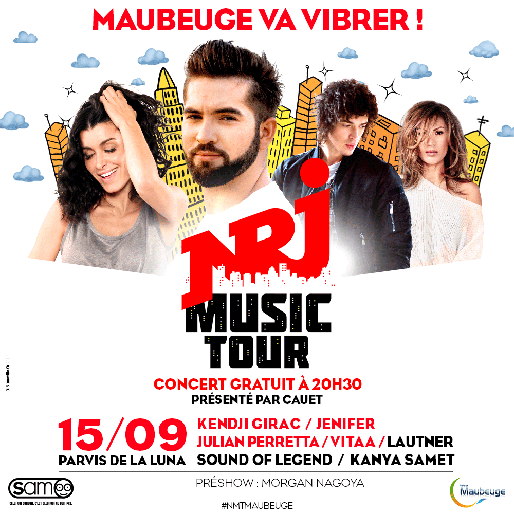 Kendji Girac, Jenifer, Julian Perretta, Vitaa, Lautner, Sound of Legend et Moran Nagoya (en pré-show) seront les invités de ce nouvel NRJ Music Tour. Dès 16h, NRJ Valenciennes (98.8) s’installera à l’Ibis de Maubeuge (avenue de la Gare), avec la chanteuse Jenifer pour cette émission spéciale, animée par Stan. Elle partagera un moment privilégié avec le public présent avant sa montée sur scène. Comme d'habitude, en tweetant sa ville et le nom de sa "star NRJ préférée" avec le hashtag #NMTMaubeuge, un auditeur tiré au sort aura la chance de monter sur scène pour présenter l'artiste de son choix. Les sites nrj.fr et NRJ Play partageront sur les images backstage des artistes et du concert. Les auditeurs connectés seront au cœur de l’événement en suivant le hashtag #NMTMaubeuge sur tous les réseaux sociaux de la radio.