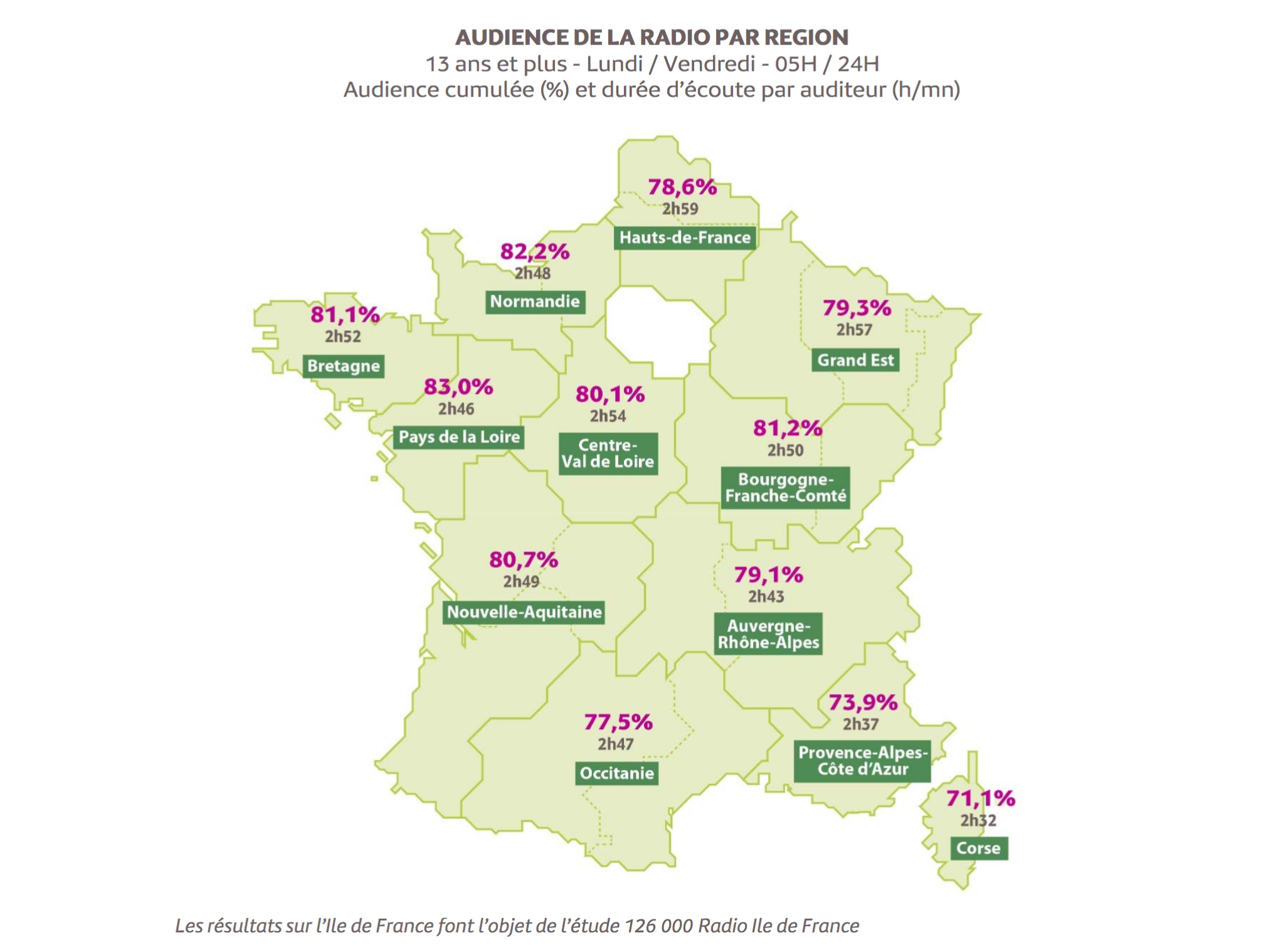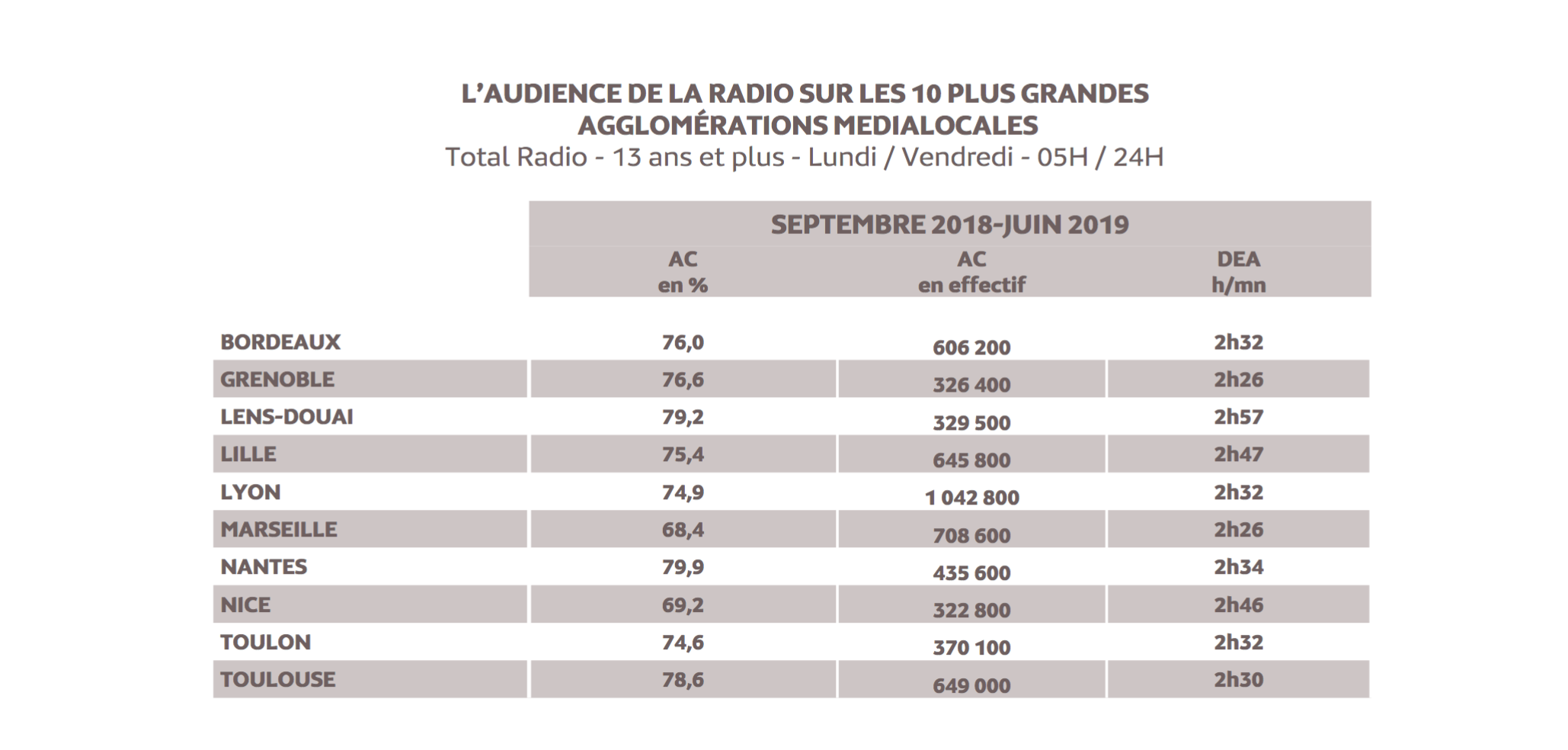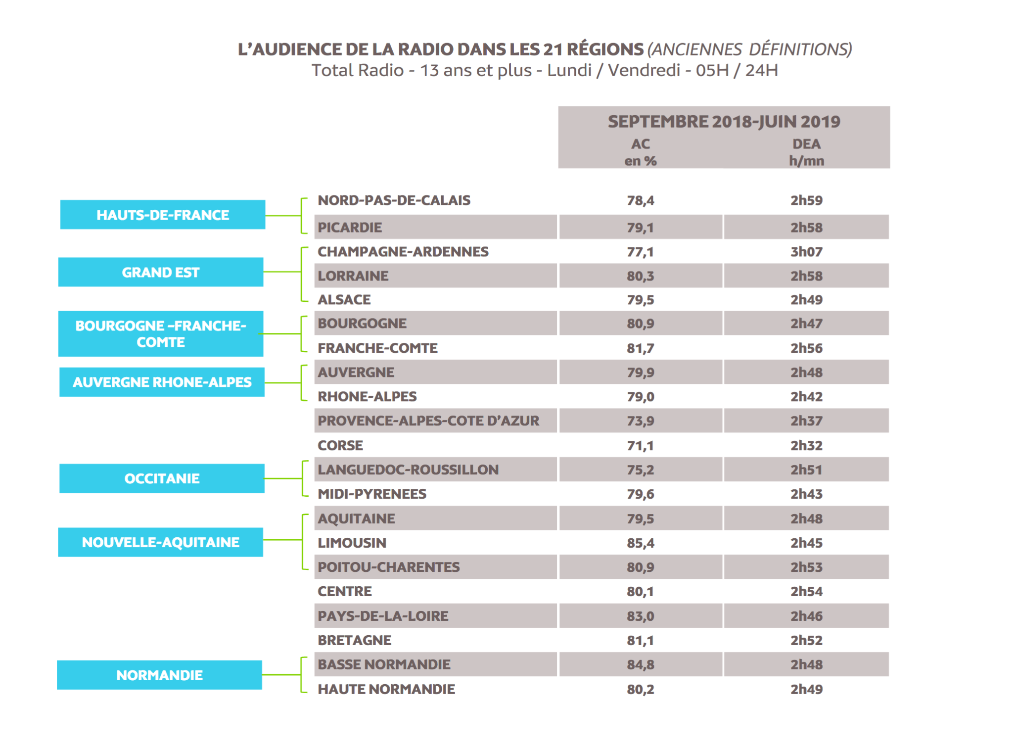 Ce matin, Médiamétrie a publié les résultats d’audience de la radio sur la période septembre 2018–juin 2019 dans les régions, ainsi que 72 départements et 97 agglomérations. Le média radio présente en effet des spécificités régionales et locales, tenant compte de l'historique des implantations, de la densité de l'offre et de la structure socio-démographique de la population.