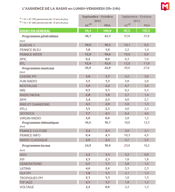 Une semaine après la publication de la première vague 126 000 de cette saison 2013-2014, Médiamétrie a publié ce matin les résultats détaillés pour l'Ile-de-France. Pour les Généralistes, RTL, France Inter et Europe 1 dépasse la barre des 10 points. Chez les musicales, NRJ affiche 9.5 d'audience cumulée devant toutes les autres stations.