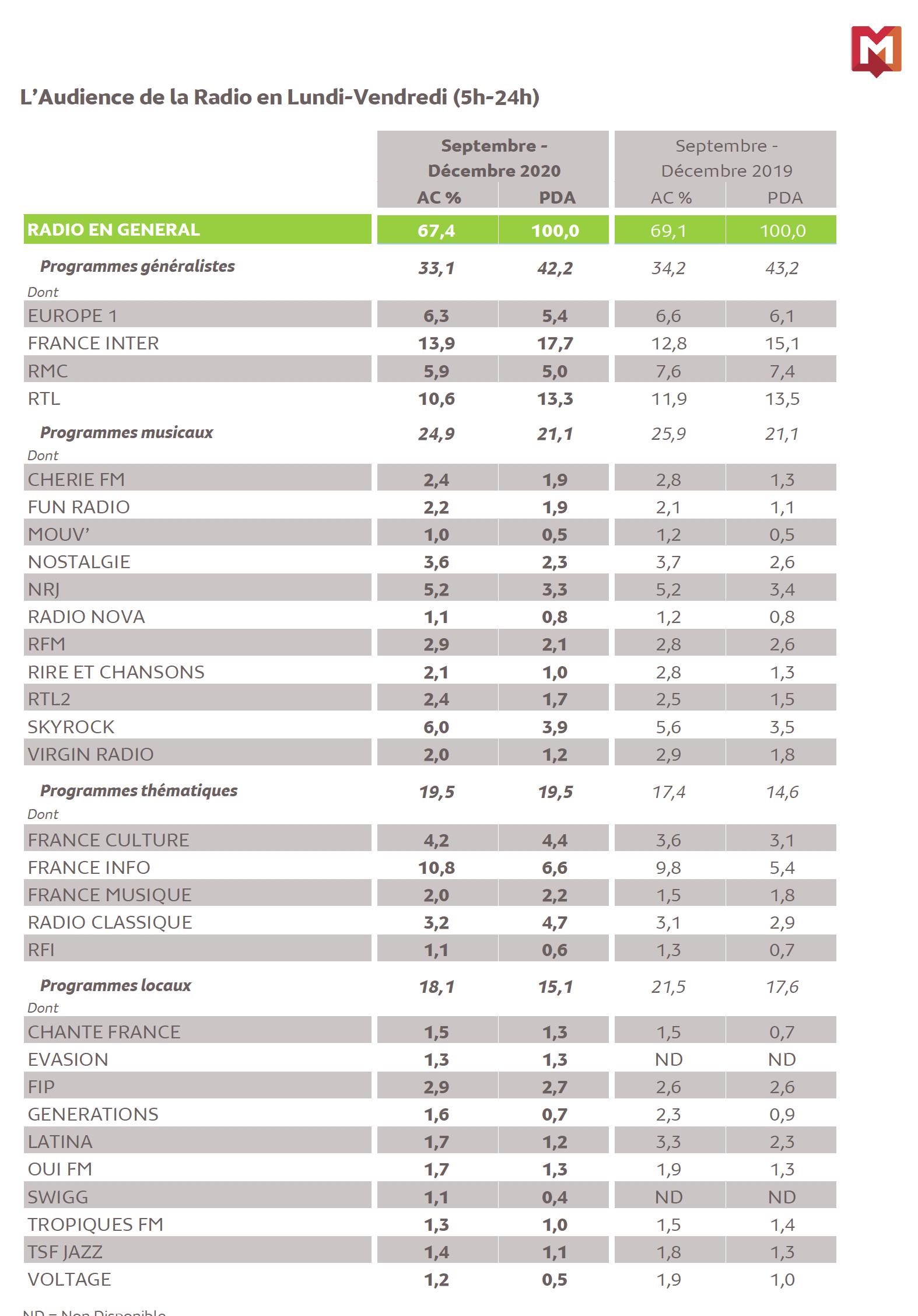 Les résultats de la précédente 126 000 IDF, parue le 26 novembre 2020, sont accessible ICI. De nombreuses stations issues de la catégorie dite des "Programmes Locaux" y brillaient par leur absence.