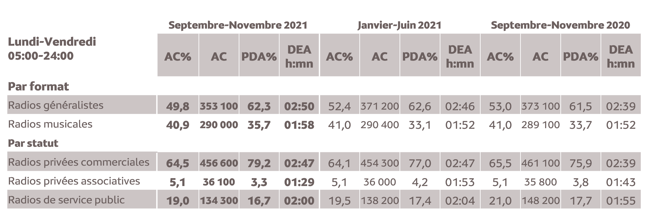 Sans surprise, Radio Free Dom demeure la première radios de l'île : 29.6% d'audience cumulée, 35.7% de part d'audience et 2h43 de DEA. Conséquence : il reste peu de place pour la concurrence qui joue des coudes. On retiendra les performances de Exo FM avec 13.1% d'audience cumulée. Sur ce même critère, Réunion La 1ère affiche 12.9% et NRJ Réunion, 11.5%. Toutes les autres stations sont en-dessous des 10 points : Chérie FM Réunion, RTL Réunion, Rire & Chansons Réunion, RER, Free Dom 2 (la petite soeur de Radio Free Dom), Urban Hit et Fun Radio.