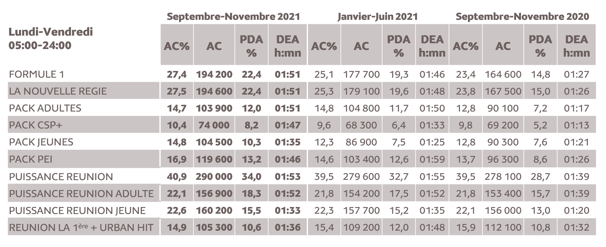 Source : Médiamétrie - Métridom Réunion Septembre-Novembre 2021 - 13 ans et plus - Copyright Médiamétrie - Tous droits réservés