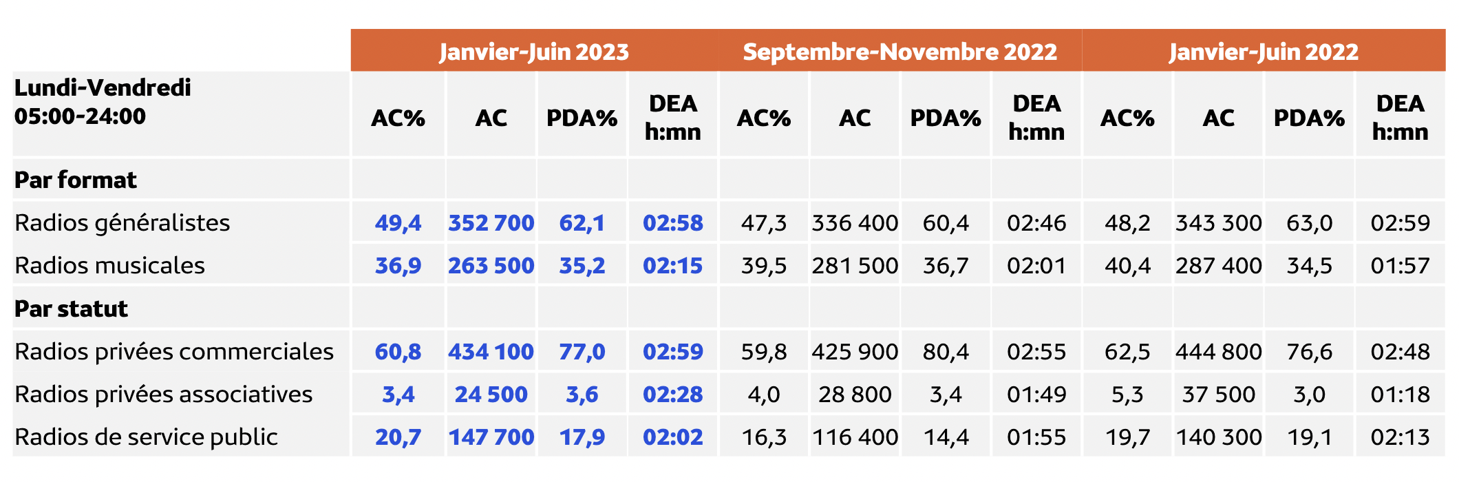 Sur la période entre janvier et juin 2023, les radios généralistes génèrent une audience cumulée de 49.4%, soit 352 700 pour 62.1% de PDA et 02h58 de DEA. Chez les radios musicales, les stations enregistrent 36.9% d'audience cumulée pour 263 500 auditeurs, 35.2% de PDA et une DEA de 02h15. Pour les radios associatives, elles génèrent 3.4% d'audience cumulée pour 24 500 auditeurs, 3.6 de PDA et 02h28 de DEA.