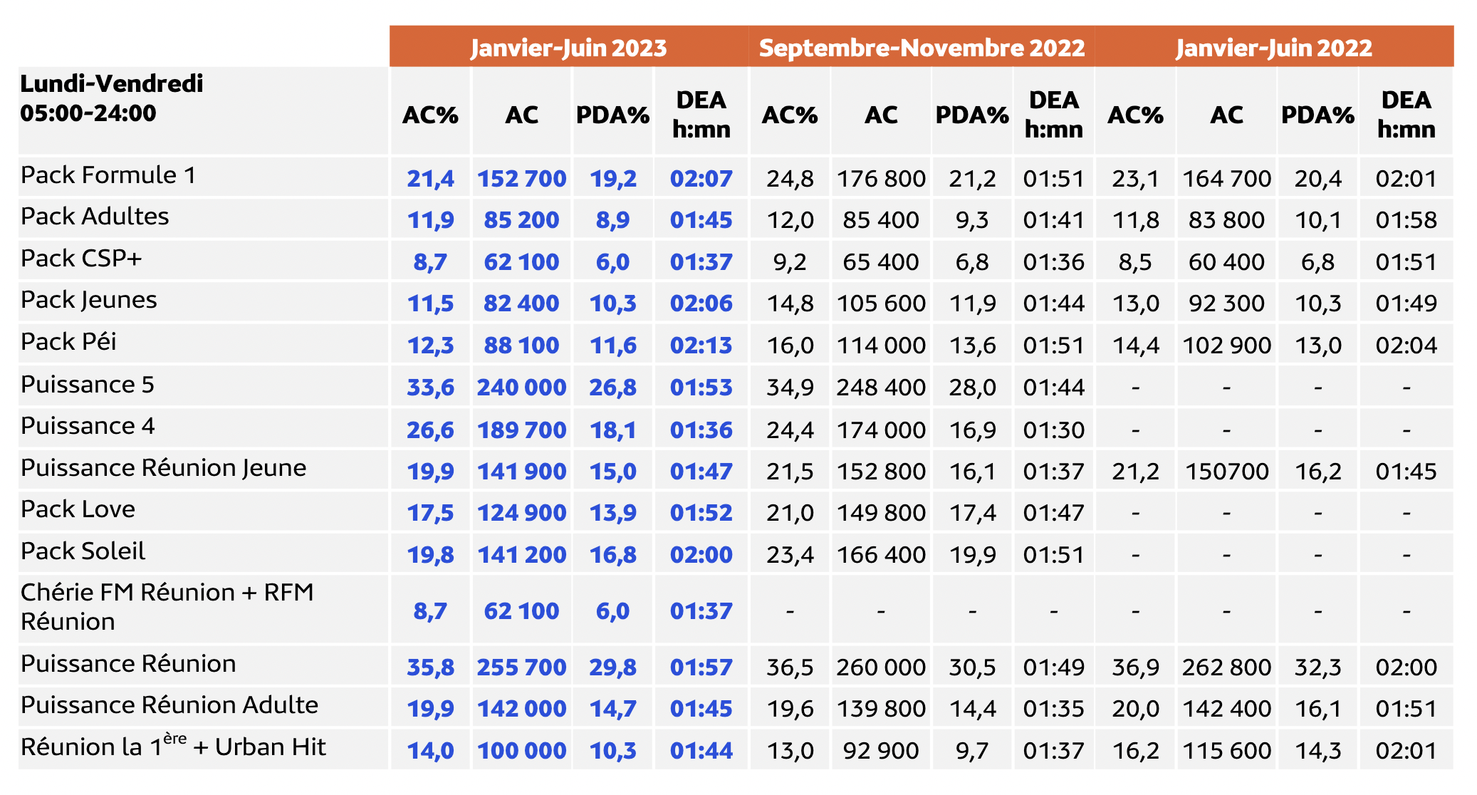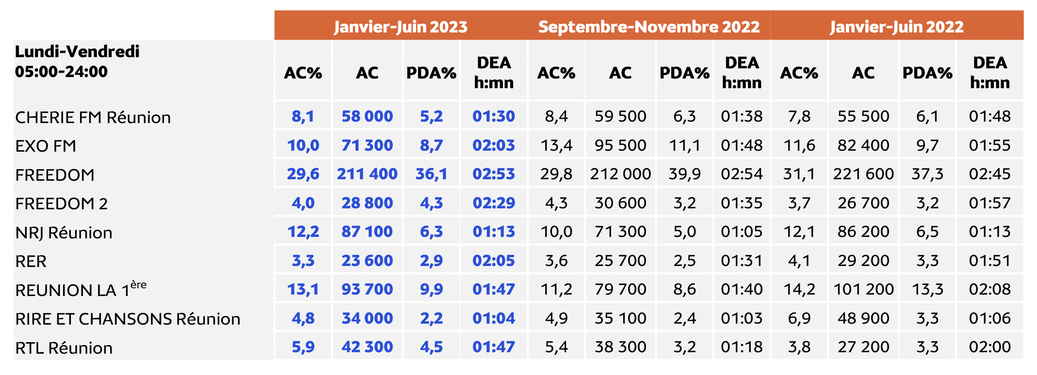 Les résultats de l'audience de la radio par station © Métridom Réunion - TV Avril-Juin 2023 – Radio Janvier-Juin 2023 - 13 ans et plus - Copyright Médiamétrie - Tous droits réservés