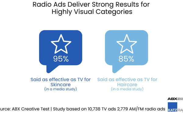 Dans les catégories très visuelles comme le skincare ou le haircare, la publicité radio affiche des taux d’efficacité comparables à la télévision. Selon une étude ABX menée sur 2 779 spots radio, 95% des campagnes skincare et 85% des campagnes haircare ont été jugées aussi performantes que les spots TV