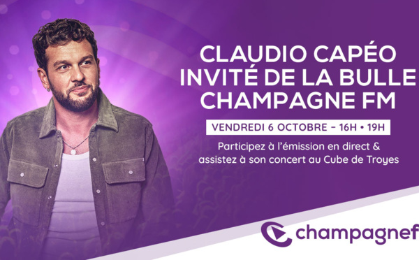 Champagne FM, la radio locale leader en Champagne-Ardenne et première locale à Troyes, annonce la venue de Claudio Capéo. Il sera l'invité de "La Bulle Champagne FM", ce vendredi 6 octobre, de 16h à 19h.
