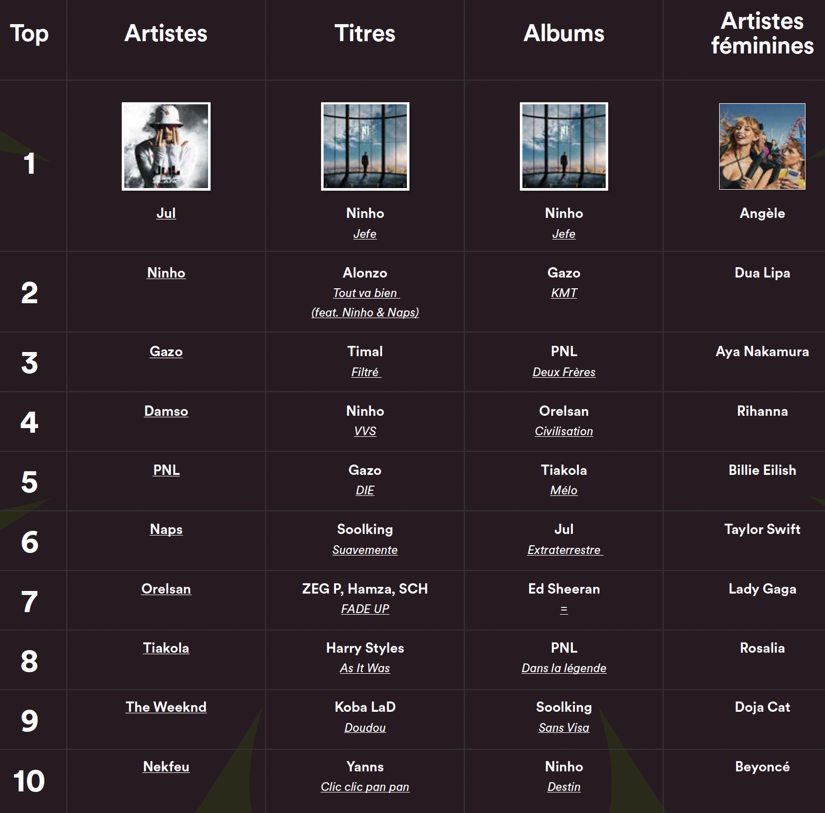 En 2022, seul l’artiste international The Weeknd arrive à se hisser dans le top 10 des artistes les plus écoutés en France, l’ensemble du reste du classement étant occupé par des artistes français. "J’ai toujours rêvé d’être dans l’top" chante Ninho dans son titre "Jefe". C’est chose faite ! Ce titre est le plus écouté sur Spotify en 2022 en France