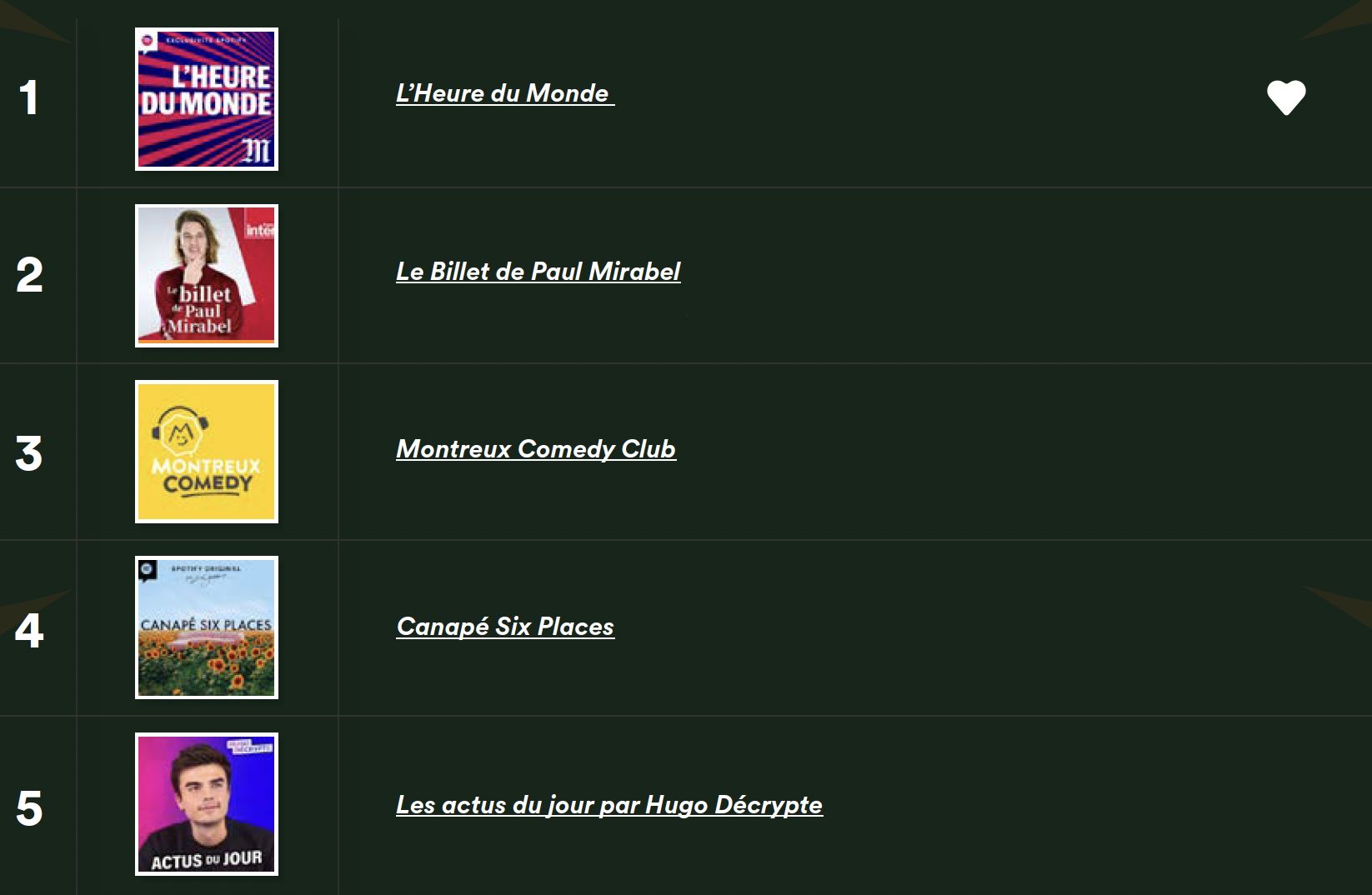 En France, le nombre de podcasts créés sur Spotify a augmenté de 75% d'une année sur l'autre, et le nombre d'auditeurs dans ce pays a fait un bond de 89%. Deuxième du classement Wrapped en 2021, "L’Heure du Monde" se hisse cette année à la première place. Ce podcast d’actualité disponible en exclusivité sur Spotify est le podcast le plus écouté sur Spotify en France. Parce que l’actualité est trop souvent sombre, les auditeurs français de podcasts sur Spotify écoutent aussi "Le Billet de Paulc Mirabel "ou encore le podcast de "Montreux Comedy Club". S’il est un podcast qui a marqué l’année 2022, c’est aussi "Canapé Six Places", un podcast Spotify Original de Lena Mahfouf. Lancé il y a seulement 1 mois, il se hisse déjà en 4e place des podcasts les plus écoutés en 2022 sur Spotify. C’est le podcast ayant enregistré, en France, le plus de streams à son lancement depuis la création de Spotify.