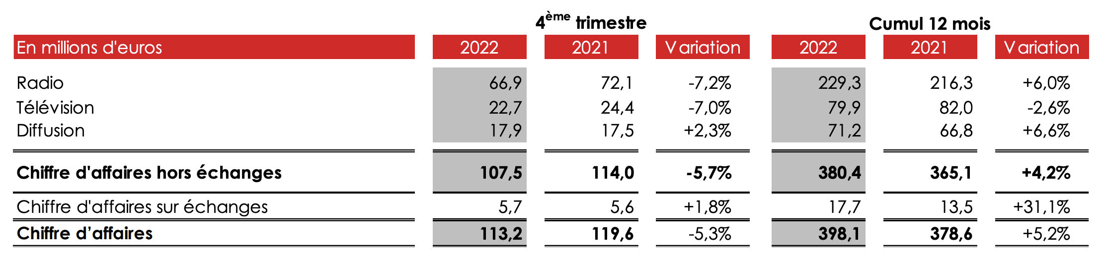 Le 4e trimestre 2022 est caractérisé par une baisse du marché publicitaire radio, due à l’incertitude économique, et par un effet de base défavorable. Ces deux éléments expliquent la baisse du chiffre d’affaires du pôle Radio de - 7.2% par rapport au 4e trimestre 2021, alors que ce pôle avait enregistré une croissance de son chiffre d’affaires sur chacun des 3 premiers trimestres de l’année 2022.