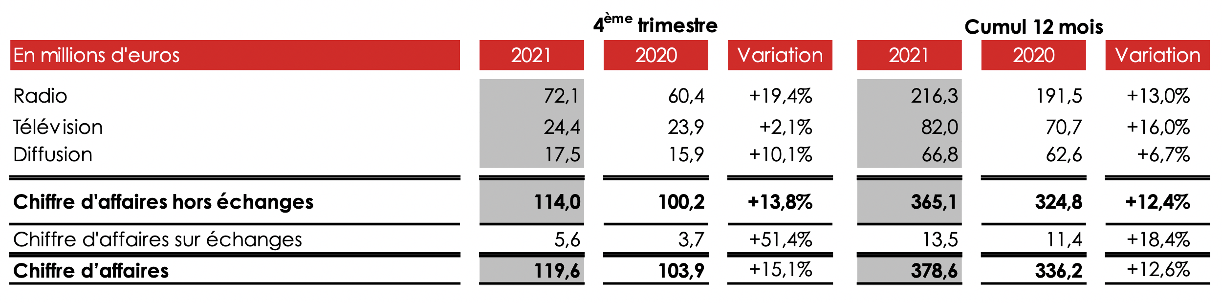 La reprise amorcée en mars 2021 par le pôle radio s’est largement amplifiée au 4e trimestre 2021 avec une forte croissance par rapport au 4e trimestre 2020, marqué par des restrictions sanitaires.