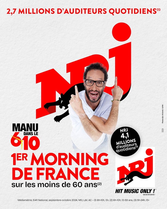 NRJ reste une référence en matière de radio musicale. Avec une audience cumulée de 7.4% (résultat le plus élevé chez les Musicales) et une part d'audience de 5.4%, NRJ attire chaque jour de nombreux auditeurs, qui passent en moyenne 1h23 à l’écoute de la station. "Manu dans le 6/10", le programme matinal emblématique, réunit à lui seul 2.7 millions d’auditeurs quotidiens, faisant de NRJ l"e premier morning de France pour les moins de 60 ans".