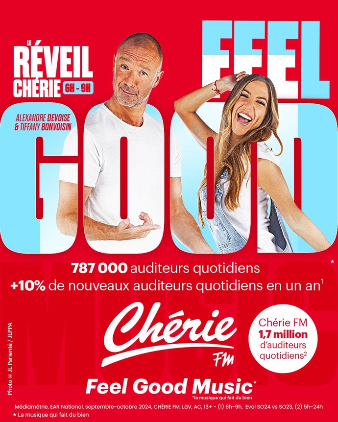 Chérie FM, qui promeut une ambiance "Feel Good Music", attire 3% d’audience cumulée, en légère baisse sur un, et enregistre une part d’audience de 1.9%. Ses auditeurs passent en moyenne 1h13 chaque jour à écouter la station, qui continue de gagner en popularité grâce à son positionnement. "Le Réveil Chérie" d’Alexandre Devoise et Tiffany Bonvoisin, programme phare de la station, rassemble 787 000 auditeurs chaque matin, avec une hausse notable de 10 % de nouveaux auditeurs en un an.