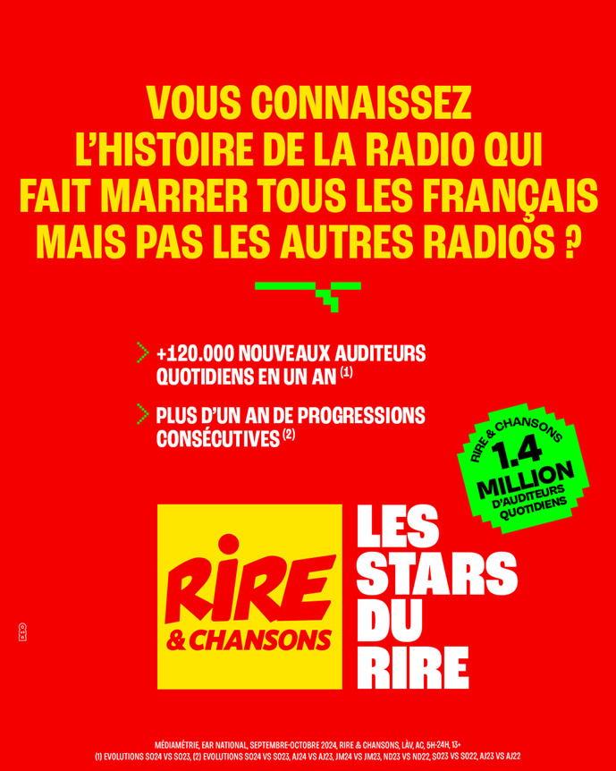 Rire & Chansons reste la référence de l’humour à la radio avec une audience cumulée de 2.5% et une part d’audience de 1.4%. Les auditeurs consacrent en moyenne 1h06 par jour à cette station. Elle continue d’attirer un public en quête de divertissement et de rire, avec une croissance de 120 000 nouveaux auditeurs en un an.