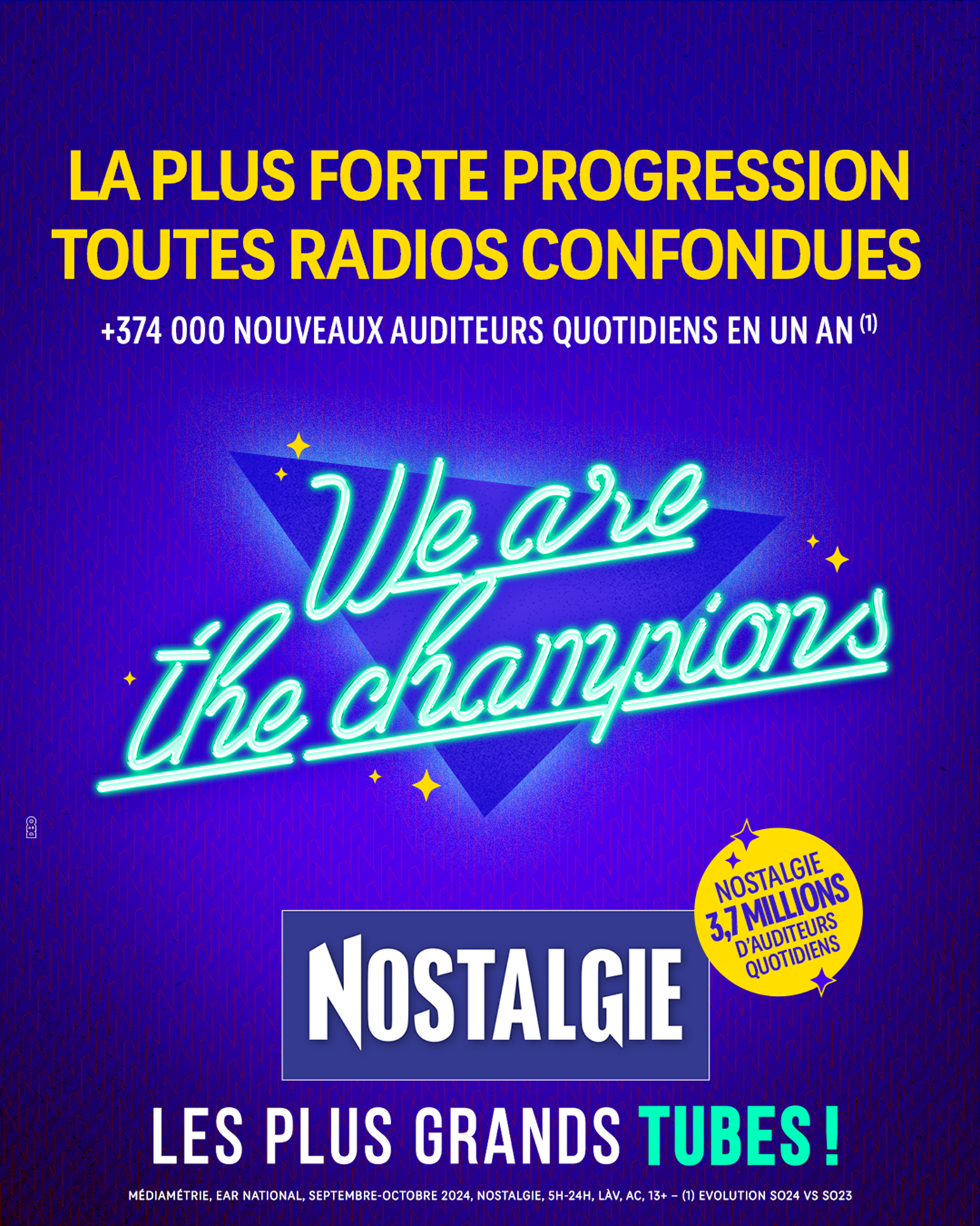 Nostalgie connaît une progression notable avec une audience cumulée de 6.6% et surtout une part d’audience de 5.7%, c'est la PDA la plus élevée chez les radios musicales. Les auditeurs de la station, qui s’inscrivent souvent dans une tranche d’âge adulte, passent en moyenne 1h38 par jour à écouter "Les plus grands tubes". Avec une augmentation de 374 000 nouveaux auditeurs en un an, Nostalgie réalise la plus forte progression de toutes les radios musicales.