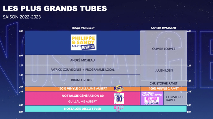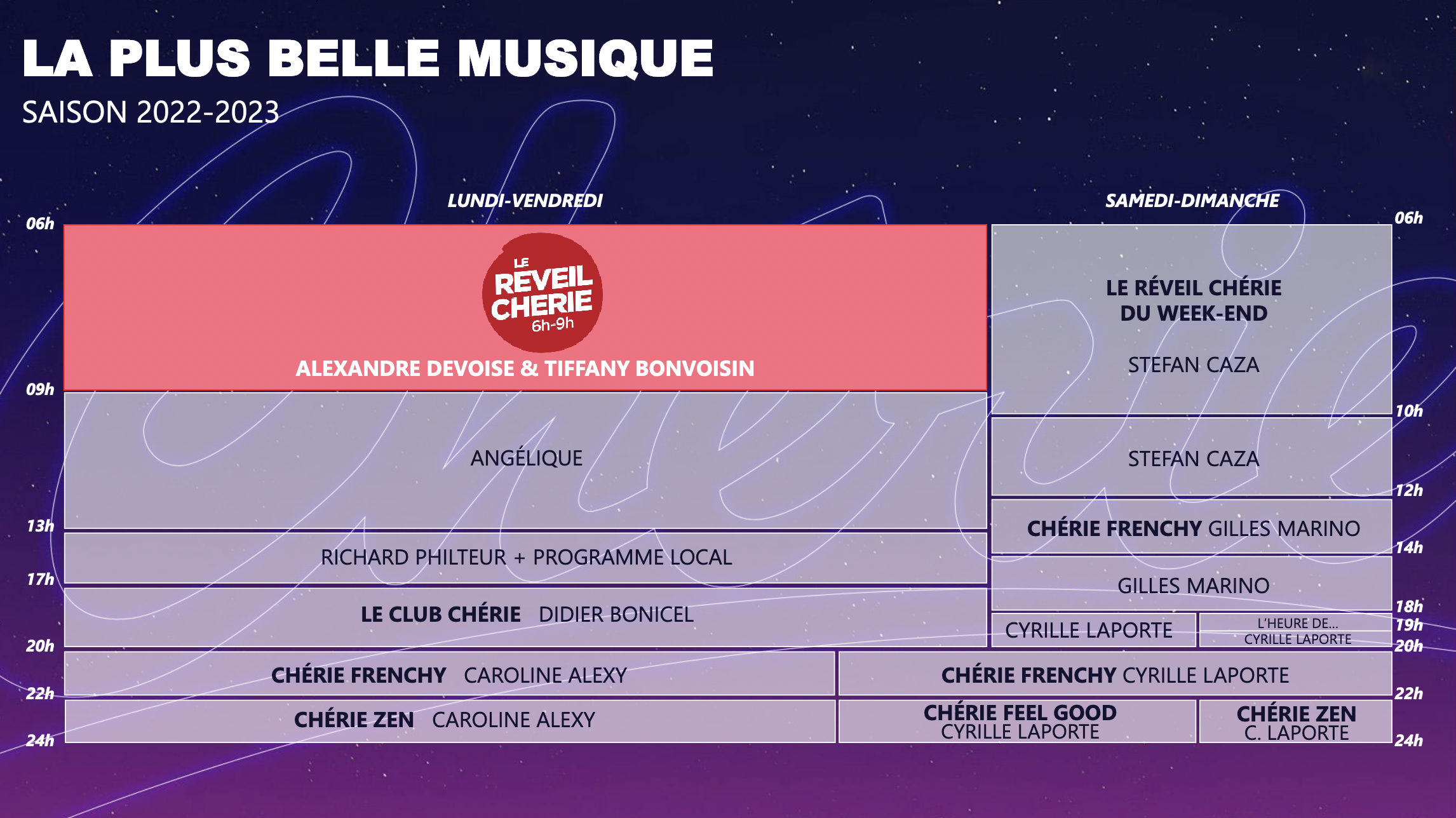 NRJ Group a renforcé ses fondamentaux, en confirmant notamment la quasi-totalité de ses grilles. Ses émissions et antennes réunissent chaque semaine plus de 17 millions d’auditeurs, confortant sa position de premier groupe radio privé de France sur les moins de 60 ans. Ainsi, "Manu dans le 6-10", "C’Cauet sur NRJ", "Philippe & Sandy" en matinale sur Nostalgie, "Le Réveil Chérie" et "Le Morning du Rire" sont de retour à l’antenne pour cette nouvelle saison, agrémentés de quelques nouveautés. Alexandre Devoise est désormais accompagné de Tiffany Bonvoisin dans "Le Réveil Chérie" en matinale sur Chérie FM et l’équipe de Bruno Roblès se renforce sur Rire & Chansons avec l’arrivée de Karine Dubernet et de La Bajon.