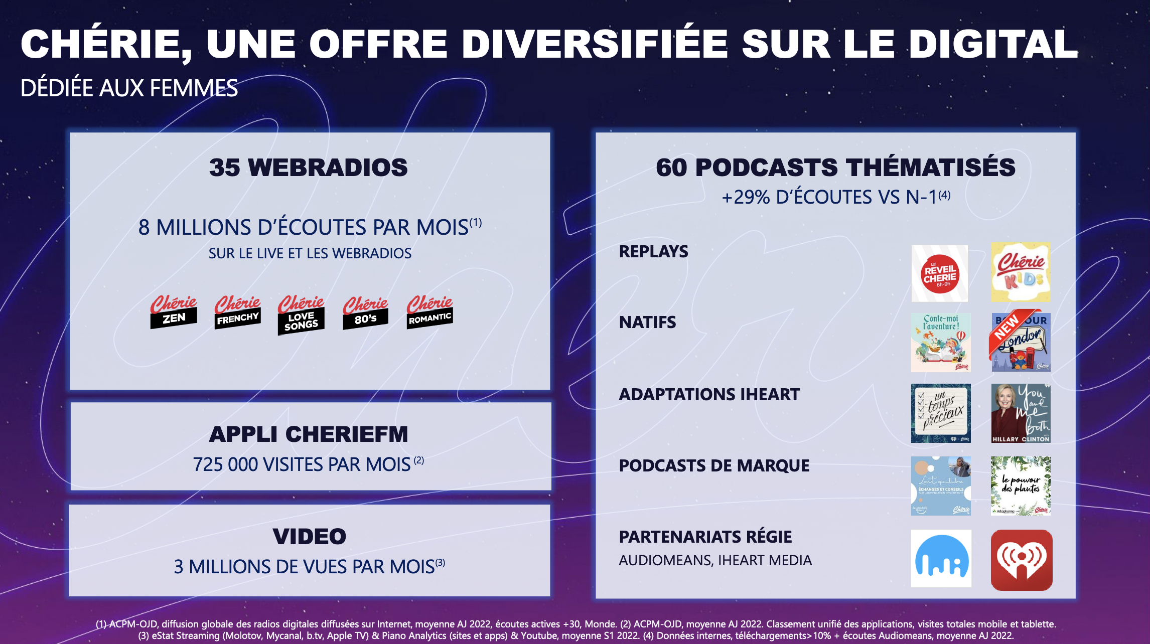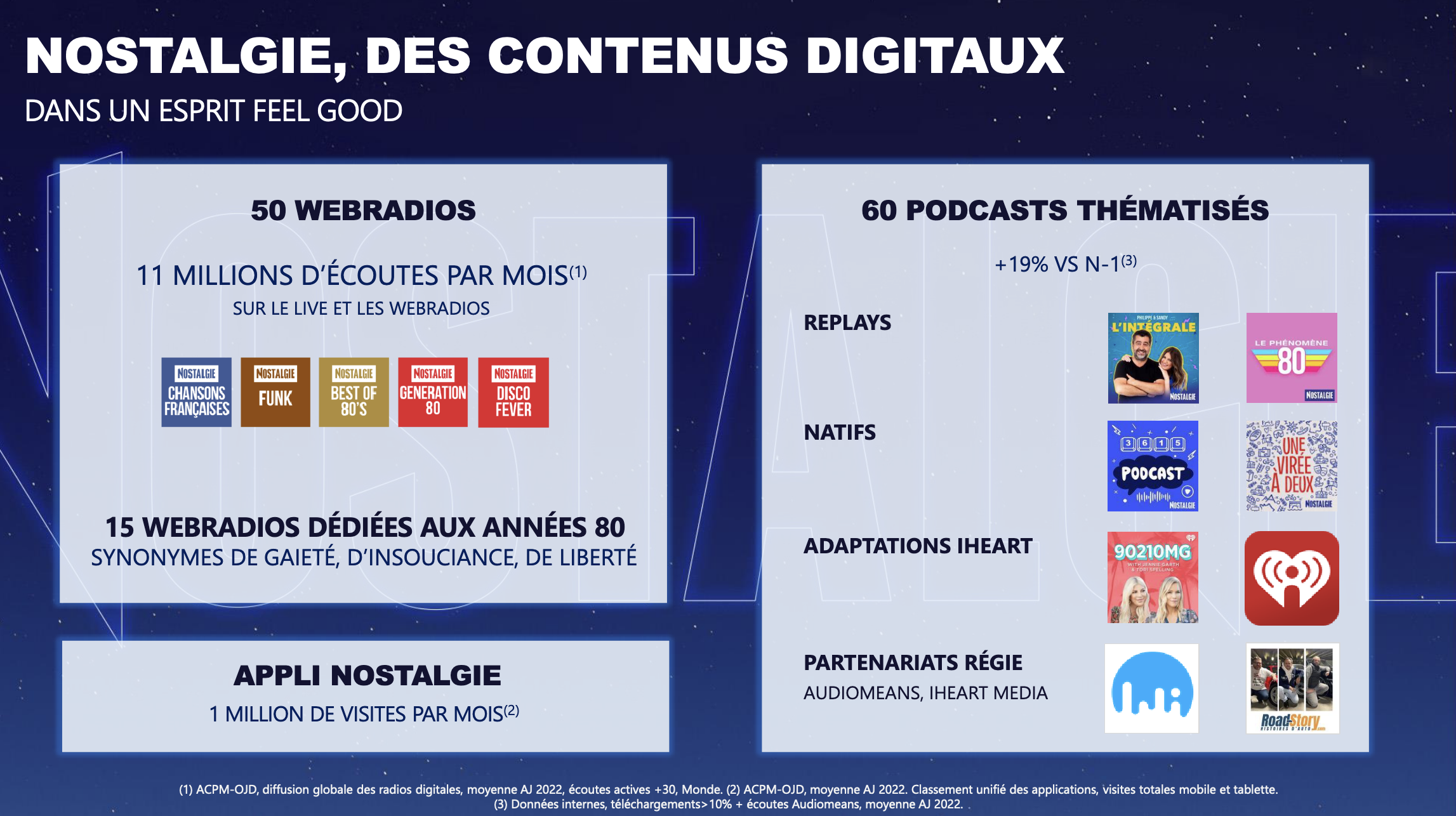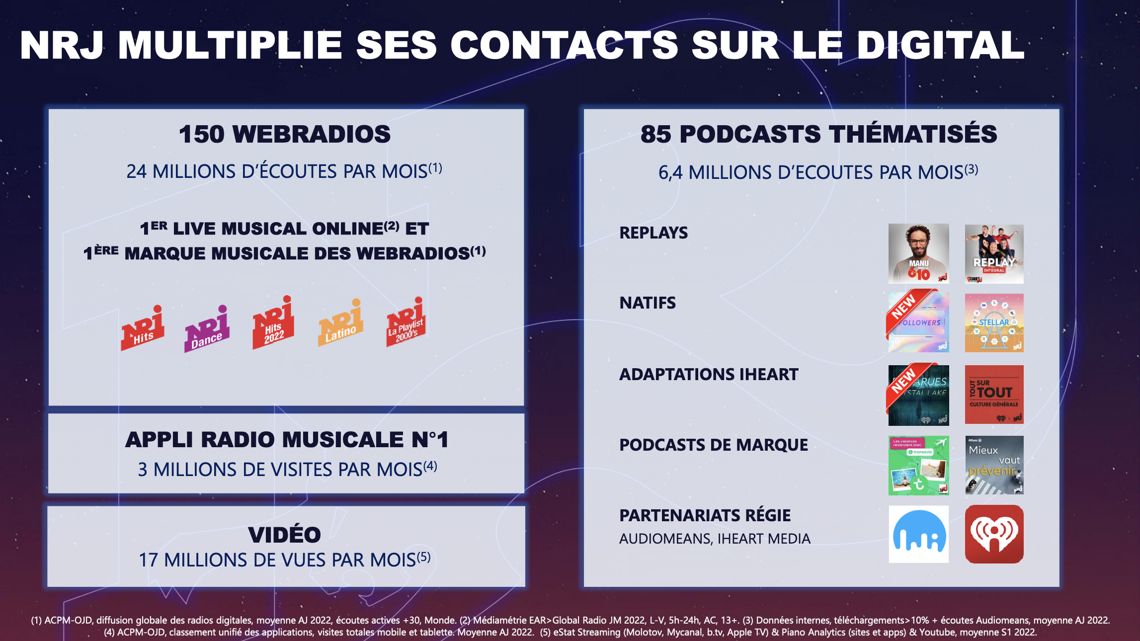 Dans un univers où le digital offre de nouvelles opportunités, NRJ Group a aussi confirmé sa place de premier groupe privé de radios digitales en France, totalisant 48 millions de sessions d’écoutes actives mensuelles et a renforcé ses positions sur les contenus audio originaux délinéarisés. En effet, ce sont déjà 10 nouveaux podcasts natifs qui ont été lancés en 2022, tels que "Tout sur Tout", "Face à face", "Stellar", "Bonjour London" ou encore "3615 Podcast". Les audiences de ces formats, associés aux marques NRJ, Chérie FM, Nostalgie et Rire & Chansons, renforcent la position d’acteur majeur du groupe en audio digital. Cette offre éditoriale très riche se déploie sur l’ensemble des supports, notamment les enceintes connectées, où le Groupe NRJ est également le premier groupe radio avec 67% de couverture.