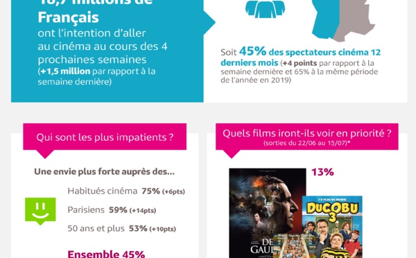 À quelques jours de la réouverture des cinémas, Médiamétrie a interrogé, comme chaque semaine, les spectateurs sur leurs intentions d’aller en salle. car les Français se déclarent chaque semaine plus nombreux à souhaiter reprendre le chemin des salles de cinéma et savent déjà quels films ils ont l’intention de voir en priorité.