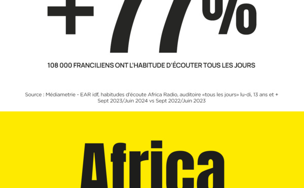 Africa Radio annonce "une croissance exceptionnelle de ses habitudes d’écoute" pour la saison 2023-2024, avec 108 000 franciliens qui ont l’habitude d’écouter Africa Radio tous les jours, soit une augmentation de 77% en un an et 411 000 qui écoutent chaque semaine, soir une évolution de 13.8% en un an.
