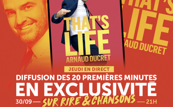 Rire & Chansons offre à ses auditeurs les 20 premières minutes de "That’s Life", le tout nouveau spectacle inédit d’Arnaud Ducret. Ce jeudi 30 septembre à 21h, ils seront aux premières loges pour vivre cet événement en live à la radio.