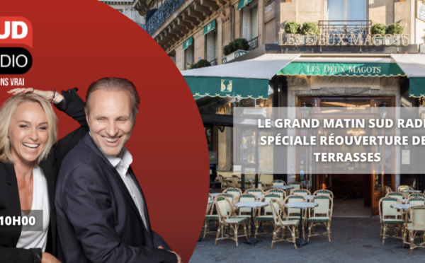 À l'occasion de la réouverture des restaurants ce 19 mai, Sud Radio donne rendez-vous en direct à ses auditeurs et en terrasse avec ses invités, ses experts ainsi que ses envoyés spéciaux. Aux quatre coins de la France, c'est avec joie et bonne humeur que les auditeurs de Sud Radio seront conviés à participer et témoigner lors d'émissions spéciales.