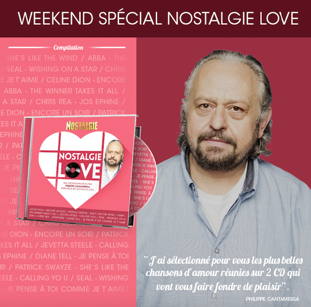 À l’approche de la Saint-Valentin, Nostalgie se met en mode Love et diffuse les plus belles chansons d’amour, pendant 48h non-stop. Tout au long de ce week-end qui précède la Saint-Valentin, les auditeurs à l’écoute de Nostalgie peuvent aussi tenter de remporter la nouvelle compilation "Nostalgie Love". Philippe Cantamessa a choisi les meilleurs titres de son émission avec Céline Dion, Seal, Abba, Patrick Swayze, Diane Tell, Jevetta Steele, Chris Rea et beaucoup d’autres.