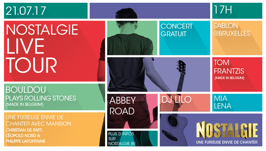 Devenu une tradition, le "Nostalgie Live Tour" s’installera sur la Place du Sablon à Bruxelles, dès 17h. L’occasion idéale de fêter la Belgique avec une série d’artistes qui emmèneront les spectateurs en musique jusqu’au célèbre feu d’artifice : Tom Frantzis, Abbey Road, Bouldou Plays Rolling Stones, Une Furieuse envie de chanter avec Mansion (Christian de Raft, Léopold Nord, Philippe Lafontaine) et Mian Lena. Nostalgie a également convié DJ Lilo qui fera danser le public présent jusqu’au bout de la nuit.