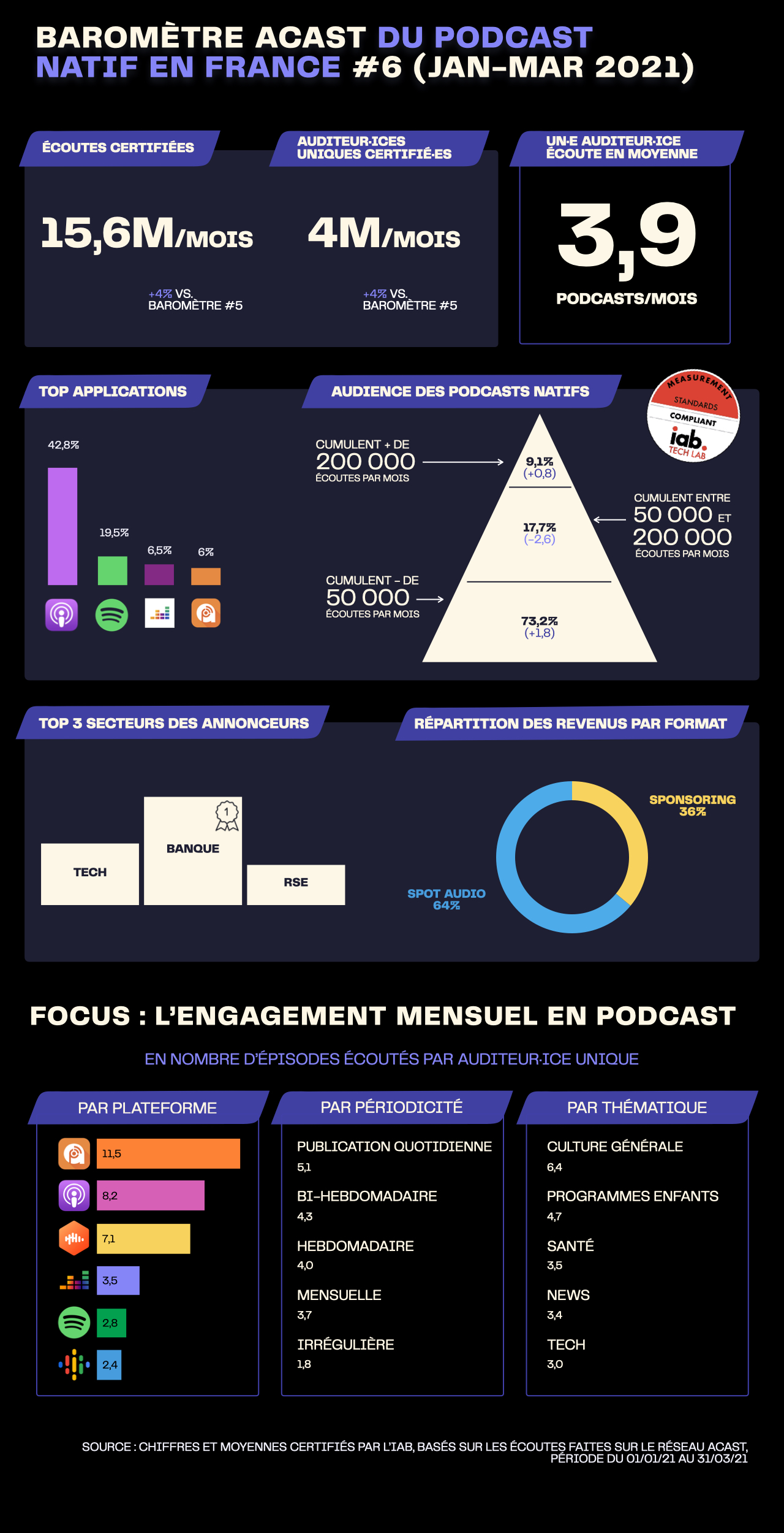 Enfin, côté répartition des revenus par format, Acast a noté que les revenus publicitaires issus du format sponsoring représentent 36% lors du premier trimestre 2021 ce qui correspond à une légère baisse du format par rapport au trimestre précédent avec 6 points en moins. Quant aux spots audio, format représentant plus de la moitié des revenus annonceurs, celui-ci a augmenté de 9 points par rapport au trimestre précédent, pour atteindre 64% des parts des revenus.