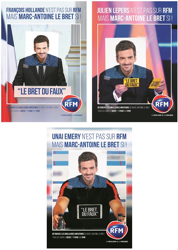 Depuis hier, trois visuels parodiques choisis et diffusés en fonction des supports sont déclinés en presse quotidienne, hebdomadaire et mensuelle. Ainsi, les auditeurs peuvent découvrir les visuels "François Hollande", "Julien Lepers" et "Unai Emery", personnages que Marc-Antoine Le Bret imite le matin. D’autres déclinaisons de ces visuels arriveront dans les prochaines semaines…