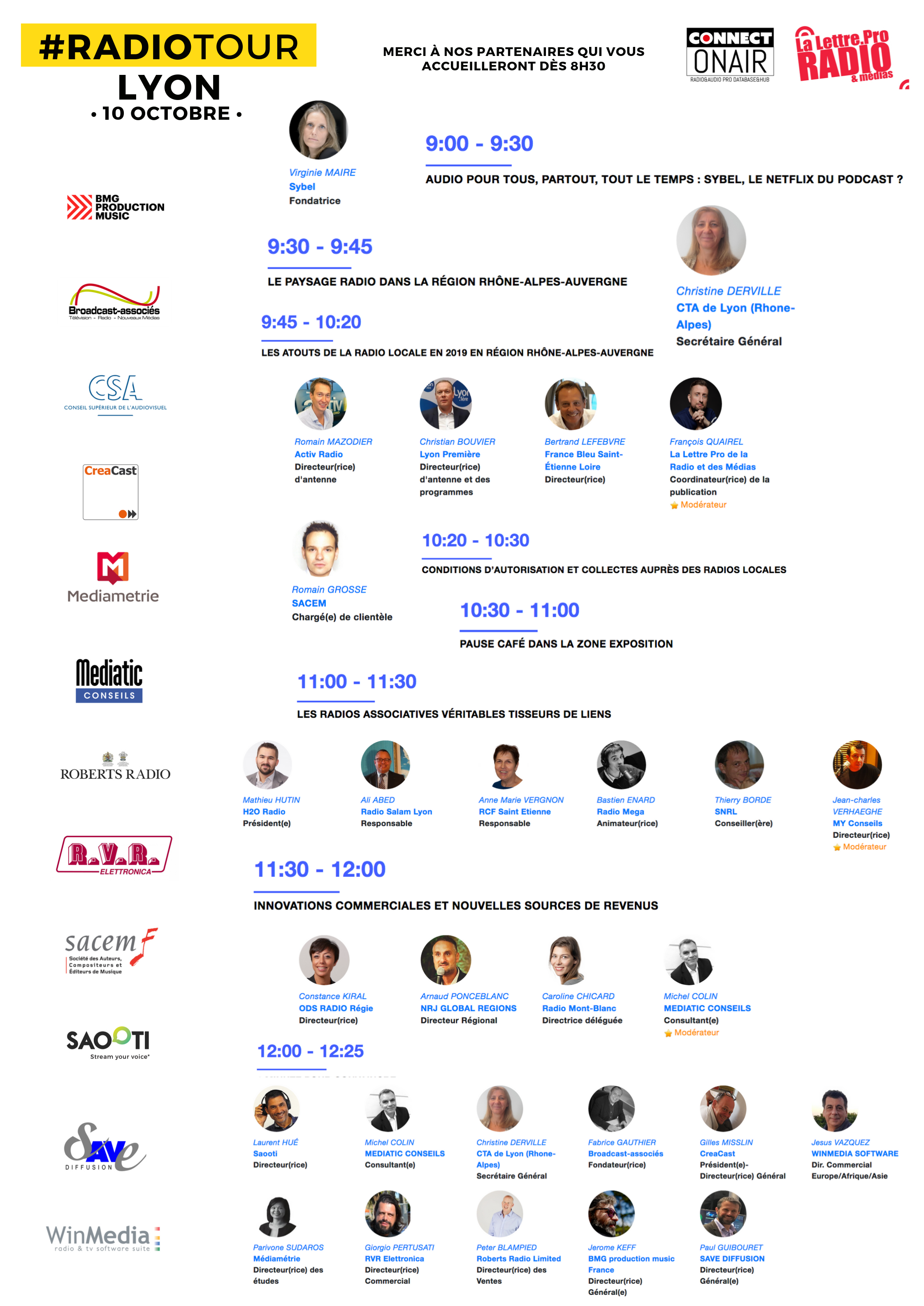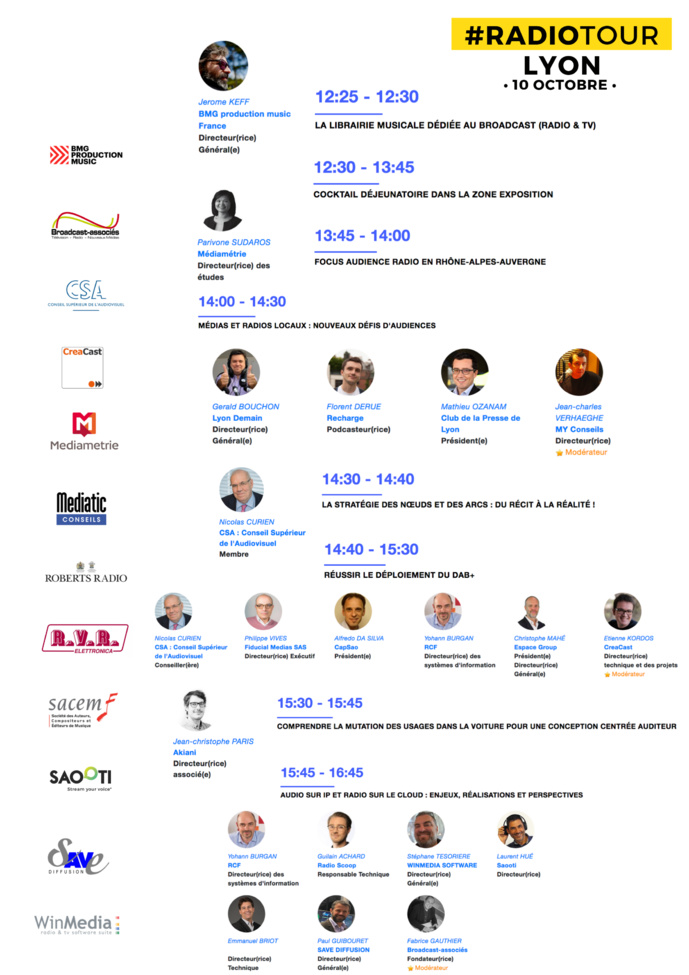 Jusqu'au 3 décembre, l'équipe du Salon de la Radio et de l'Audio Digital prend la route et fait étape aux quatre coins de France grâce au RadioTour. Six dates et six villes pour des journées de conférences gratuites et de rencontres réunissant les professionnels pour comprendre, découvrir et trouver des solutions concrètes répondant aux enjeux de la radio d'aujourd'hui et de demain. La prochaine étape du RadioTour s'arrêtera le 10 octobre à l'Hôtel Mercure Lyon Centre SAXE Lafayette. Toutes les radios de la région Auvergne Rhône Alpes y sont attendus. Plusieurs professionnels partageront leurs expériences comme Virginie Maire (Sybel), Nicolas Curien (CSA), Bertrand Lefebvre (France Bleu), Caroline Richard (Radio Mont Blanc) ou encore Christine Derville (CTA de Lyon) et Christophe Mahé (Espace Group).