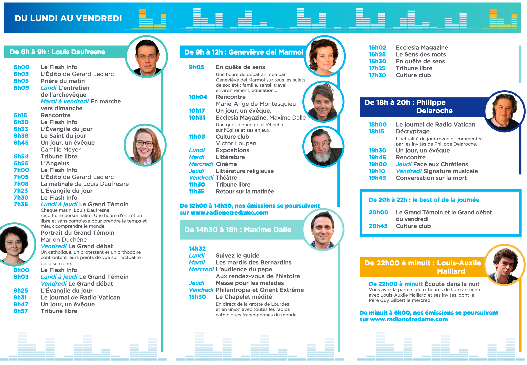 Pour cette nouvelle saison, Radio Notre Dame veut relever "les défis d'un temps où le besoin de comprendre, le besoin de confiance et de spiritualité sont toujours plus forts". Selon la station, l'audience rajeunit (60% des auditeurs ont entre 35 et 65 ans) et 15% écoutent via le web et les réseaux sociaux. Aussi, Radio Notre Dame veut être écoutée et vue...