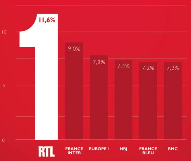 Pour la station de la rue Bayard, les choses sont claires : "RTL est première radio de France sur le critère de la Part d’Audience (PDA) avec 11,6% de PDA pour RTL et 7,4% de PDA pour NRJ. RTL est première radio de France sur le critère de la Durée d’Écoute (DEA) avec 2h18 chaque jour pour RTL et 1h25 chaque jour pour NRJ".