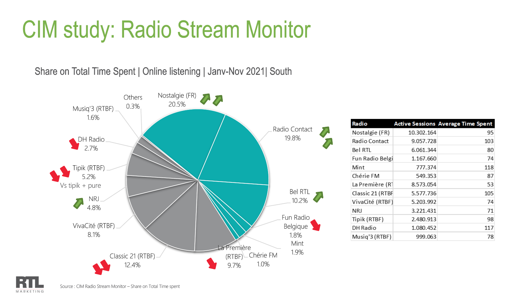 Le CIM Radio Stream Monitor mesure l’écoute digitale de la radio, en comptabilisant chaque jour toutes les connexions aux serveurs des radios belges. Comme en 2020, sur l’année 2021, Nostalgie est la radio la plus écoutée online en Belgique francophone avec 10 302 164 sessions actives, 95 minutes de durée d’écoute moyenne et une part d'audience de 20.5%.