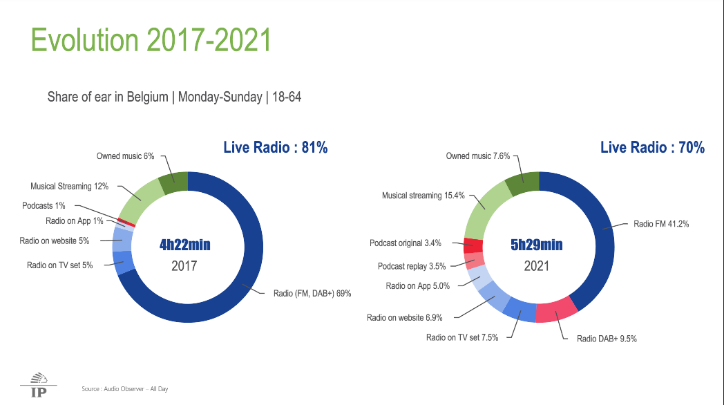 Depuis quatre ans, les comportements d’écoute ont beaucoup évolué. L’univers de l’audio est en effet de plus en plus riche et il s’étend aujourd’hui à de multiples formats de contenus. Une nouvelle offre s’est développée, notamment avec les podcasts et le streaming. La radio en live représente 70% de la consommation d’audio. L’essentiel de l’écoute se fait en utilisant une radio classique mais le Smartphone et le PC ont pris une place de plus en plus importante. L'écoute via le site web atteint 6.9% du volume et l'écoute via l'application, 5%. Le DAB+ se porte également bien avec 9.5%.