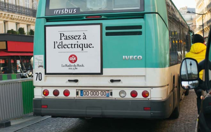 La campagne de Oüi FM, conçue par l’agence Jésus et Gabriel, sera déployée en région parisienne à partir du 16 janvier sous le nez des automobilistes grâce au judicieux réseau bus de Métrobus. Bien sûr, il s’agit là d’un clin d’oeil. "Le passage à l’électrique se fera d’abord par la fréquence 102.3 FM où l’automobiliste, coincé dans les embouteillages, pourra faire le plein d’électricité sous la forme du meilleur rock qui soit" souligne Oüi FM. Alors, qu'attendent les auditeurs parisiens pour passer à l'électrique ?
