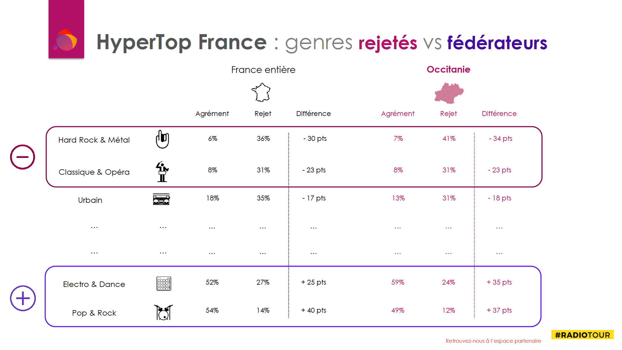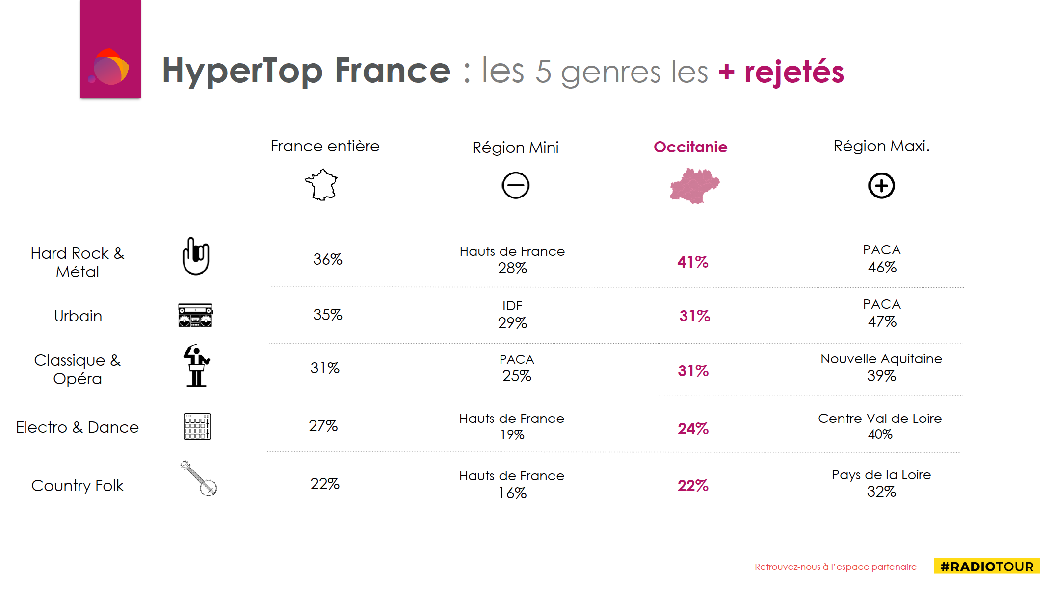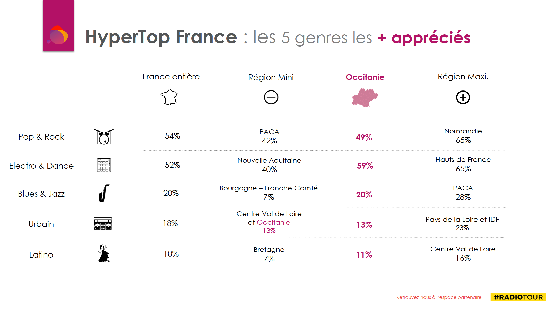 Parmi les 5 genres musicaux les plus appréciés par les auditeurs d'Occitanie : l'Électro-Dance (59%), le Pop Rock (49%), le Blues et le Jazz (20%), le genre urbain (13%) et le genre Latino (11%) selon une enquête exclusive réalisée par HyperWorld. Par ailleurs, il faut noter que les auditeurs de l'Occtanie sont 41% a rejeté le Hard Rock et le Métal, 31% a rejeté l'Urbain, la musique classique et l'opéra, 24% à rejeté l'Électro-Dance et 22% a rejeté le genre Country Folk.