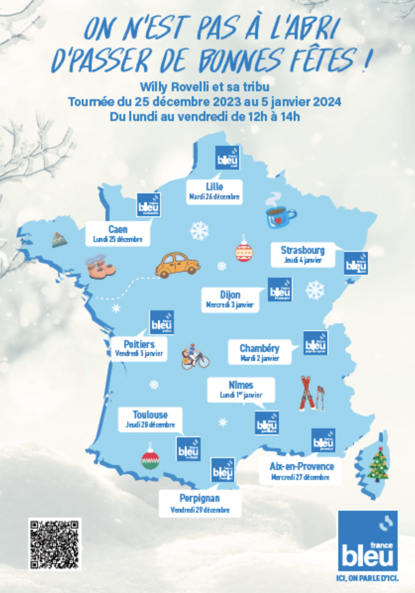 Le dimanche 24 décembre 2023 de 20h à minuit, Willy Rovelli animera, en direct, "Les Mots de Noël", la libre antenne de France Bleu. Puis, du 25 décembre 2023 au 5 janvier 2024, du lundi au vendredi de 12h à 14h, "On n’est pas à l’abri d’passer de bonnes fêtes". Willy Rovelli et sa tribu se rendront dans 10 stations locales de France Bleu pour deux heures d’émission quotidiennes en direct : bonne humeur, rires, partages et échanges avec nos auditeurs.