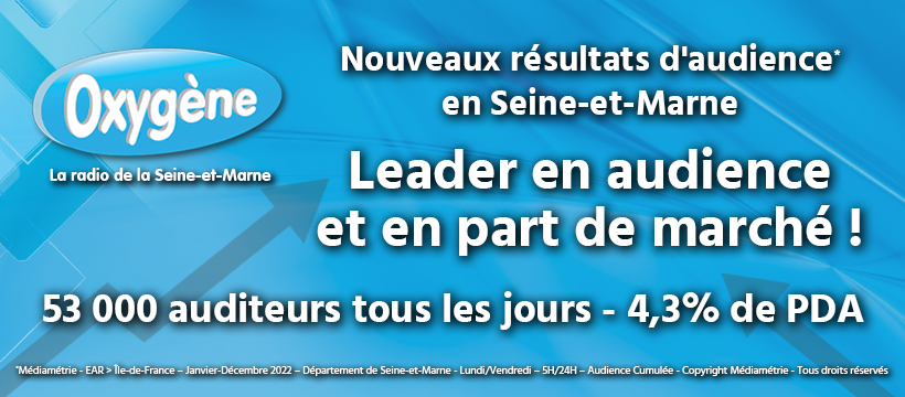 Pour la première fois de son histoire, Oxygène la radio de la Seine et Marne, se hisse désormais à la première place des programmes locaux en audience cumulée avec 53 000 auditeurs à l’écoute chaque jour, soit un taux de pénétration de 4.4% sur le département de la Seine et Marne. La hausse sur un an est de 29.5% soit la meilleure progression pour une station sur la région Ile de France toutes radios confondues.
