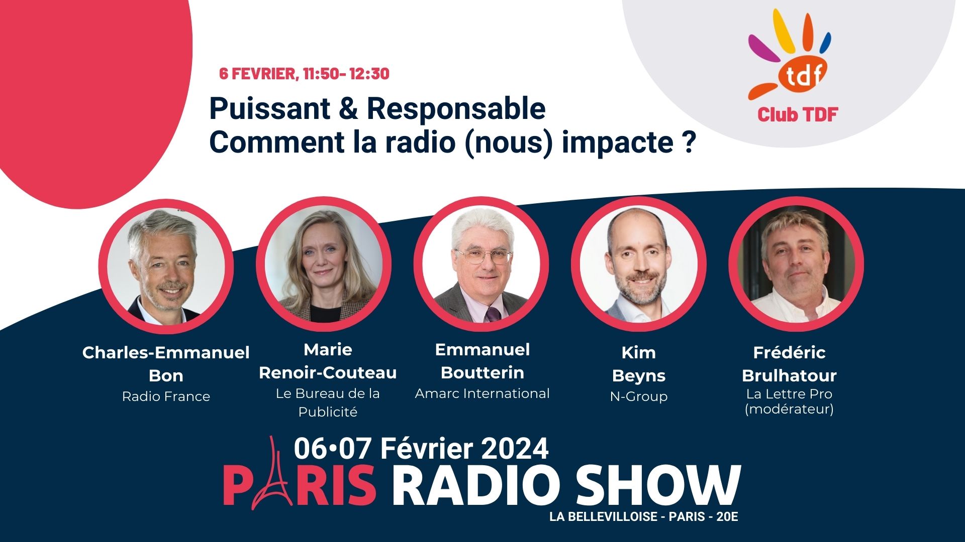 Les atouts d’aujourd’hui de notre média seront-ils les mêmes à la fin de cette prochaine décennie ou connaîtront-ils des évolutions naturelles ou forcées ? Dans cette conférence qui sera proposée au Paris Radio Show, il s’agira surtout de mettre en avant les forces de la radio. Le média demeure puissant dans le cœur des Français. De la plus petite à la plus grande, nous verrons comment la radio s’adapte pour coller à son temps et tenir sa position. Charles-Emmanuel Bon (Radio France), Marie Renoir-Couteau (Le Bureau de la Radio), Kim Beyns (NGroup) et Emmanuel Boutterin (SNRL) partageront leur constat et leur vision de l’avenir.