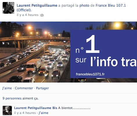 Il semblerait que oui... Après avoir annoncé, il y a quelques jours sur son compte Twitter, son départ de Nostalgie où il animait Happy Days, Laurent Petitguillaume laisse aujourd'hui échapper un indice sur sa page Facebook quant à son prochain poste. L'animateur a écrit simplement "A Bientôt" en insérant un des visuels de France Bleu 107.1...